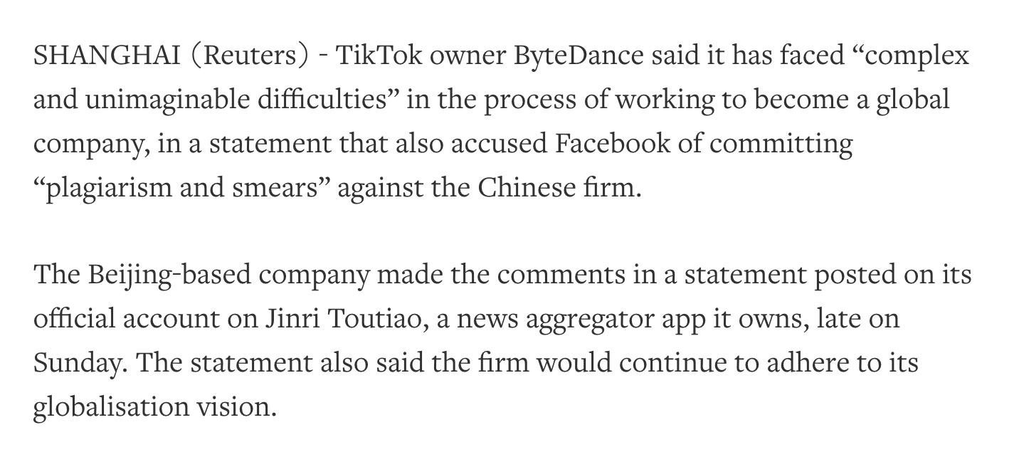 Business Insider On Flipboard Chinese Internet Company Bytedance Which Owns The Popular Video App Tiktok Accused Facebook Of Plagiarism And Smears In Response To Zuckerberg Criticism